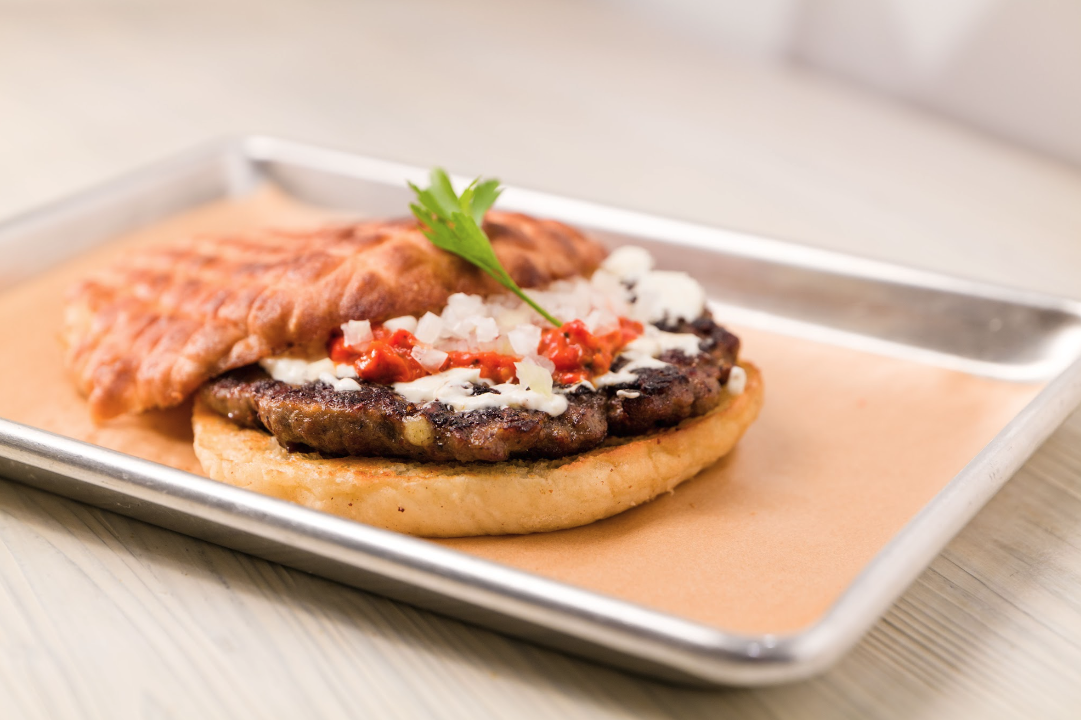 10 oz. Beef patty loaded with bacon, cheese, and chilli flakes served on homemade pita bread. *All items from the Grill are served with Ajvar (roasted bell pepper spread), Kajmak (Balkan cream cheese), and Chopped Onions.