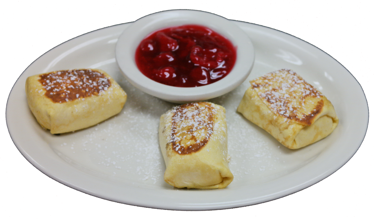 These tender, filled crepes are a delectable treat on their own, and you can pair them with your choice of sour cream or applesauce for added richness. To take it to the next level, you can also add a dollop of blueberry or strawberry compote for just $1.99 extra, creating a burst of fruity flavor that complements the creamy cheese filling.