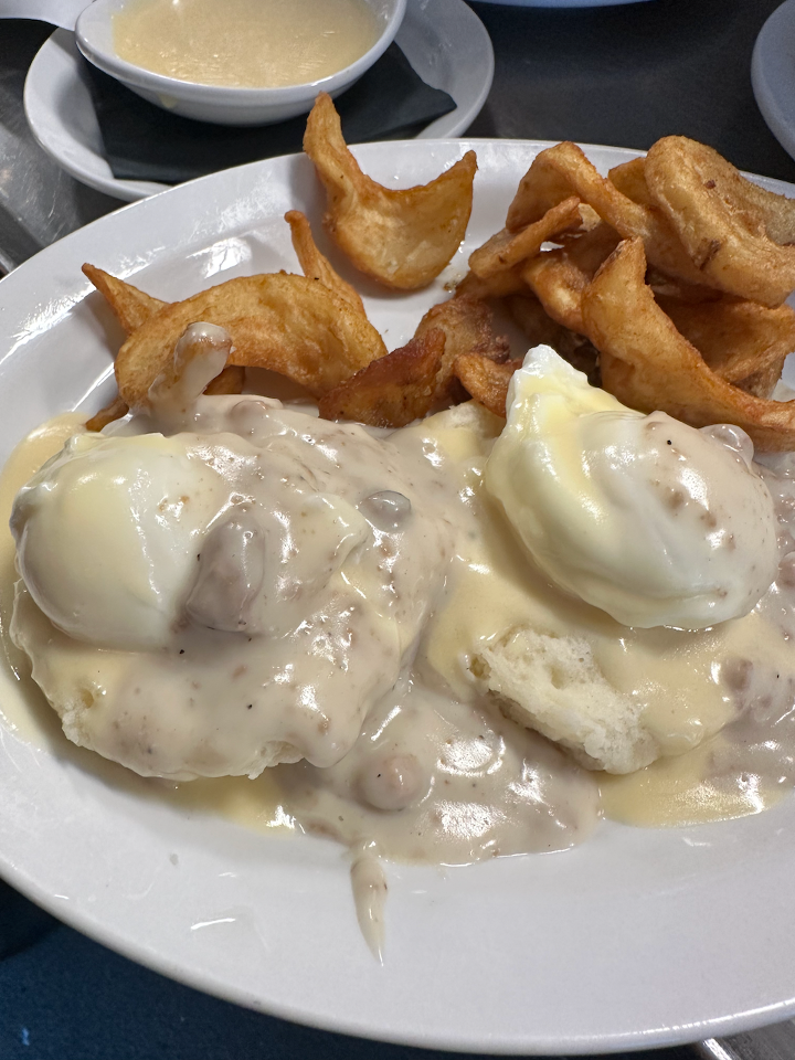 We start with freshly baked biscuits as the foundation, then pile on savory sausage and generously smother it all in our housemade creamy gravy. It's a rich and comforting brunch choice that combines the best of classic biscuits and gravy with the elegance of a Benedict.