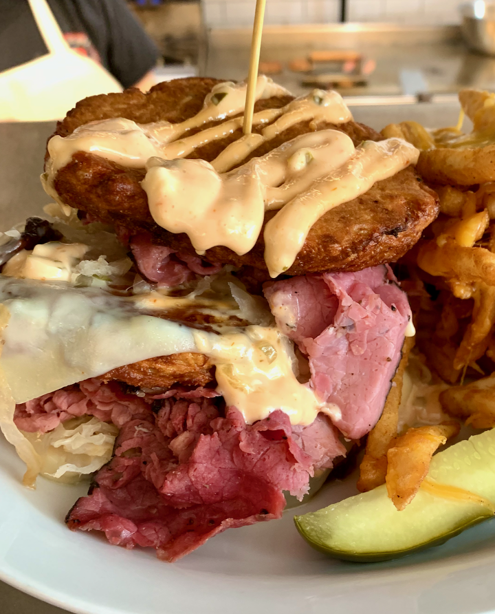 Indulge in a mouthwatering stack of three of our famous potato pancakes, each one perfectly golden and crisp. Crowned with a savory ensemble of tender corned beef, flavorful pastrami, tangy kraut, and melted Swiss cheese. To add the final flourish, a drizzle of our signature Russian dressing ties it all together for a taste sensation that's nothing short of legendary.