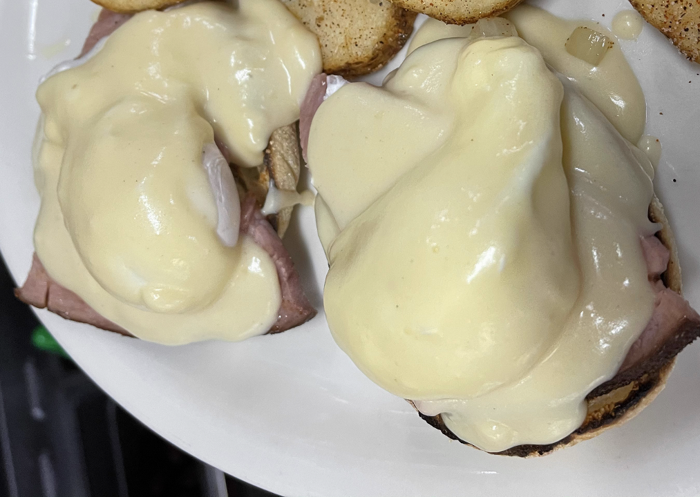 We begin with a toasted English muffin as the base, top it with perfectly grilled ham, and crown it with perfectly poached eggs. This dish is then drizzled with a cheesy hollandaise sauce for a rich and satisfying brunch.