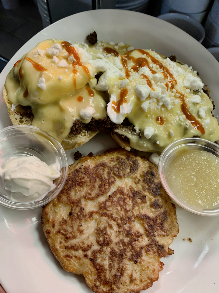 This innovative creation features two crispy potato latkes as the base, each topped with our delectable housemade corned beef hash. It's a harmonious blend of textures and flavors, where the crispy latkes perfectly complement the savory corned beef hash. A poached egg on each latke adds the final touch, creating a brunch experience that's both hearty and satisfying.