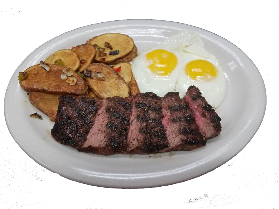 Our Grilled Sirloin Steak is cooked to perfection, served alongside two eggs prepared just the way you like them. You can choose your favorite side, whether it's sliced tomatoes, home fries, or something else. Plus, enjoy a fresh bagel with cream cheese to complete your delicious morning meal.