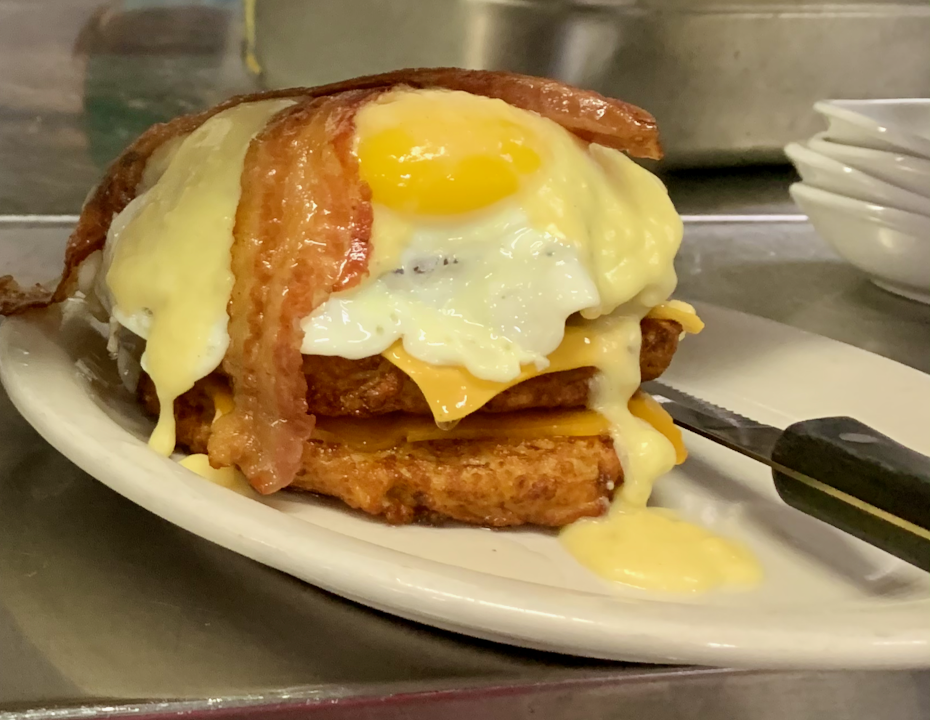 Prepare for a breakfast extravaganza with our Ultimate Potato Pancake Breakfast Stack. We pile three of our famous potato pancakes high, and on top of this crispy foundation, we stack two perfectly cooked eggs, crispy bacon, flavorful ham, savory sausage, and a blend of cheddar and American cheese. To add a creamy finishing touch, we drizzle it all with our housemade cheesy hollandaise sauce. It's a breakfast masterpiece that's hearty, cheesy, and utterly delicious.