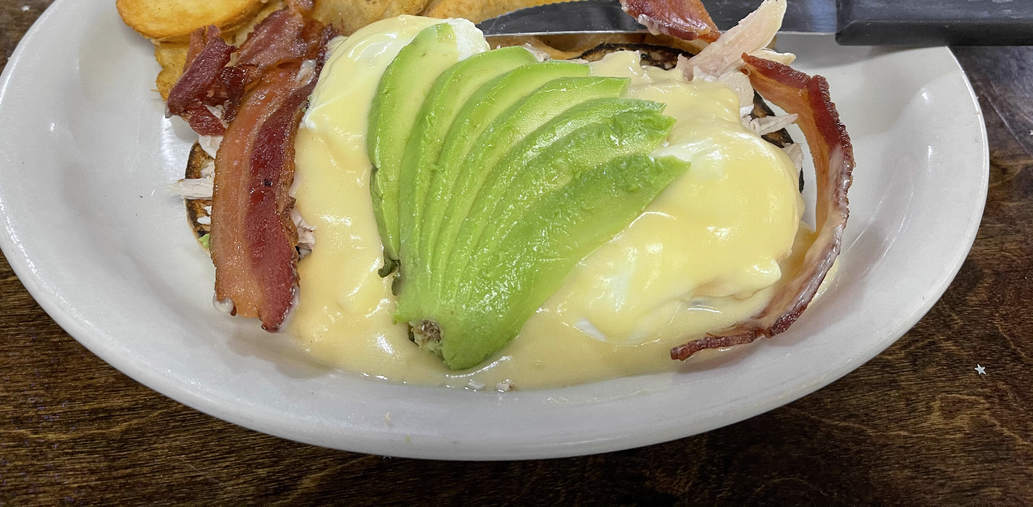 Elevate your brunch experience with our indulgent Turkey, Bacon, and Avocado Benedict. This delightful dish features a toasted English muffin as the base, layered with succulent house-roasted turkey breast, crispy bacon, and creamy avocado. To complete the ensemble, we crown it with perfectly poached eggs and drizzle it all with a cheesy hollandaise sauce. It's a luxurious and flavorful twist on a classic brunch favorite.