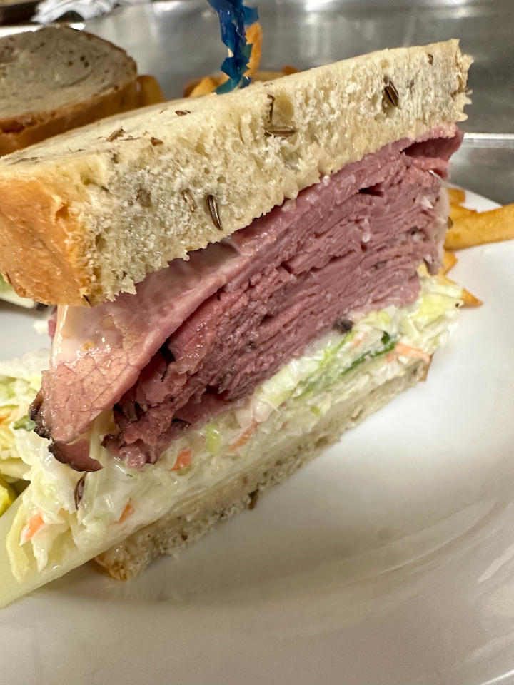 Experience deli perfection with your choice of premium corned beef or flavorful pastrami, stacked high on fresh rye bread. Layered with Swiss cheese, crunchy coleslaw, and our zesty Russian dressing, it's a mouthwatering masterpiece that's sure to satisfy your cravings.