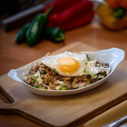 Chopped pork belly, sautéed with onions, chilies, with lemon served sizzling on a hot plate. A crispy, savory, and zesty in every bite, topped with egg for extra richness. Extra rice at an additional charge
