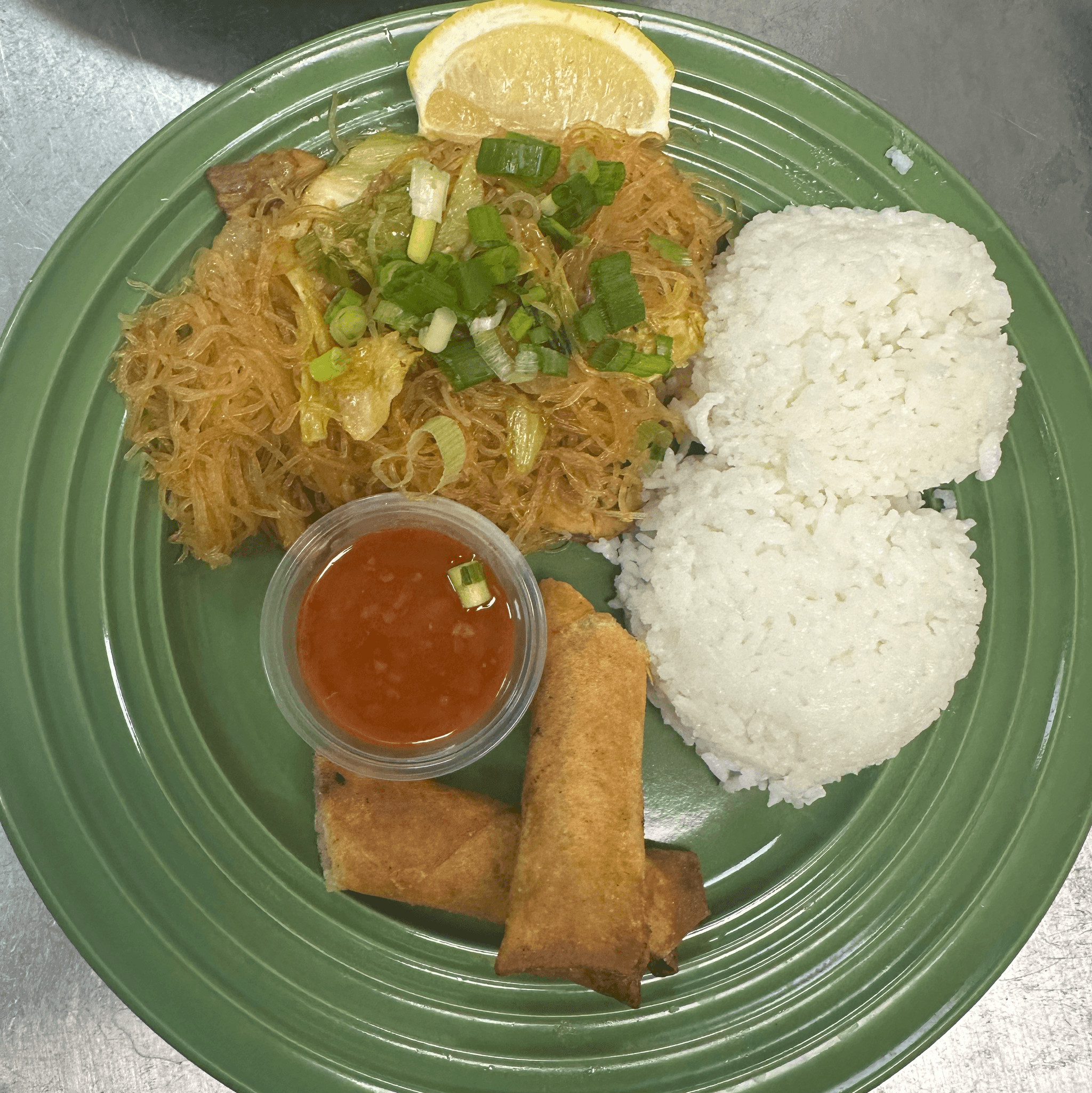 Pansit, lumpia and rice . Served with two scoops of rice. Extra rice at an additional charge