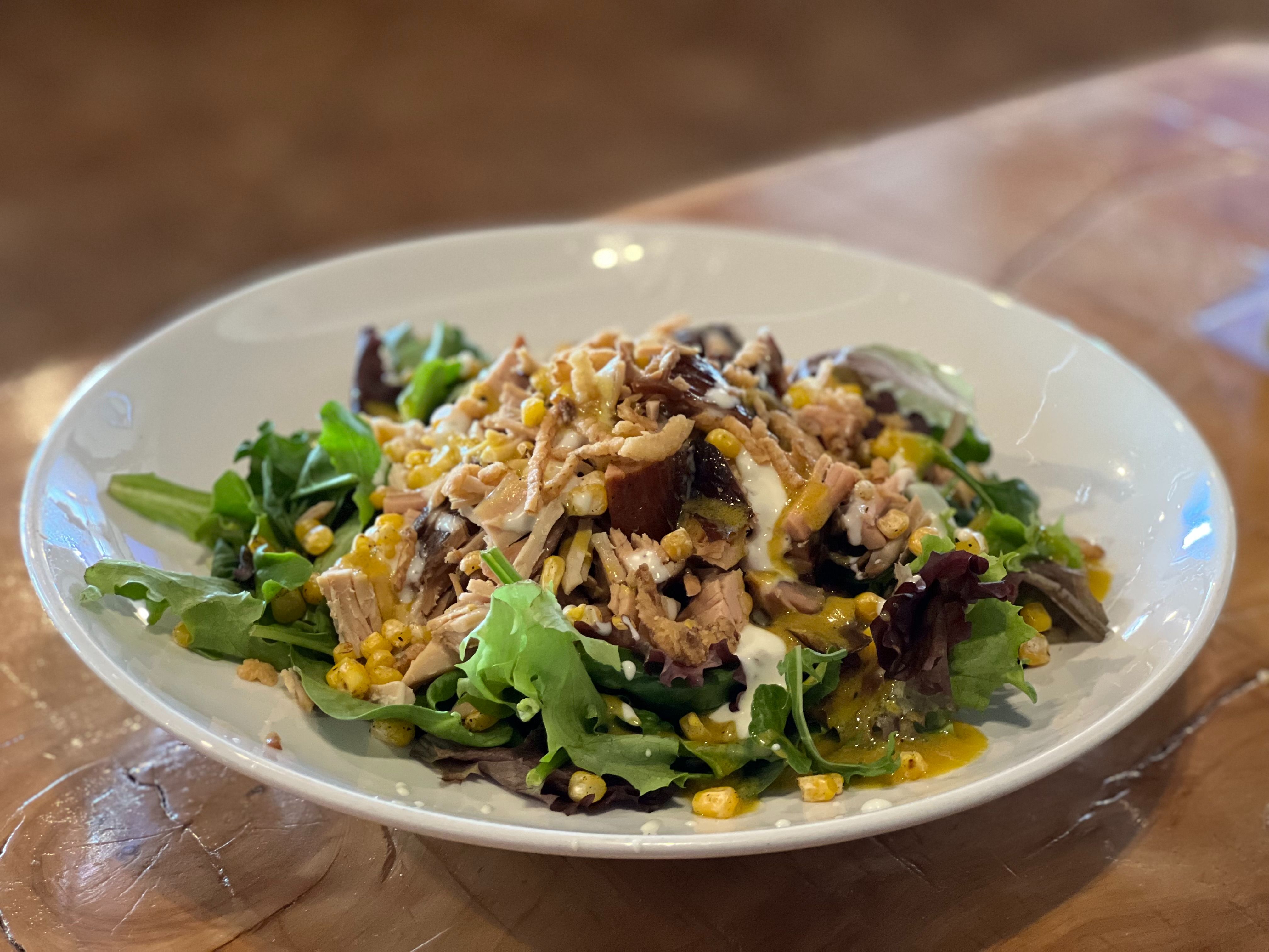 Smoked turkey, charred corn, & crispy onions served on a bed of mixed greens and topped liquid gold vinaigrette.