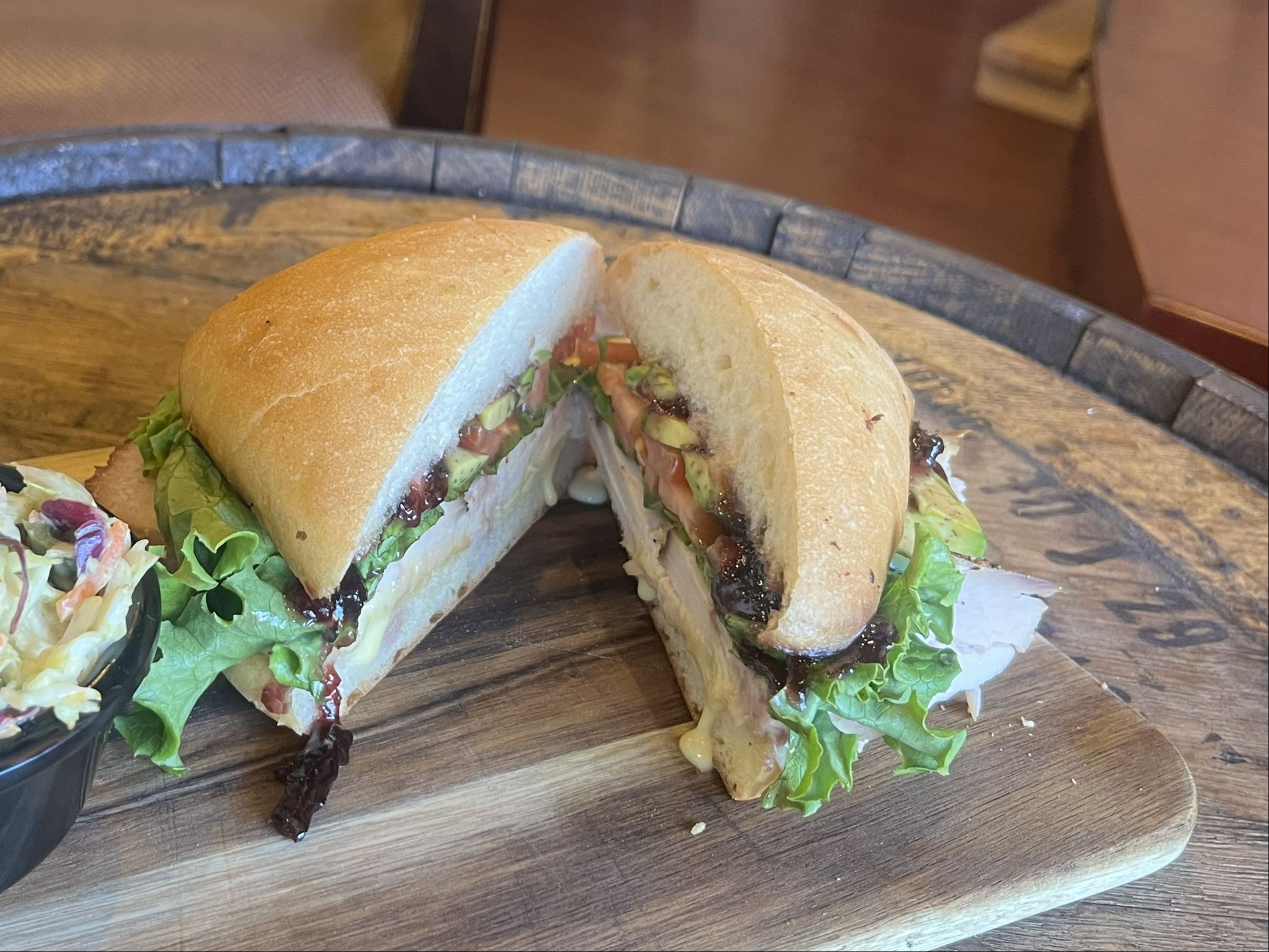 House smoked turkey, served on avocado slices, brie cheese, topped with blackberry preserves, green leaf lettuce and tomatoes. Served on a grilled ciabatta bun.