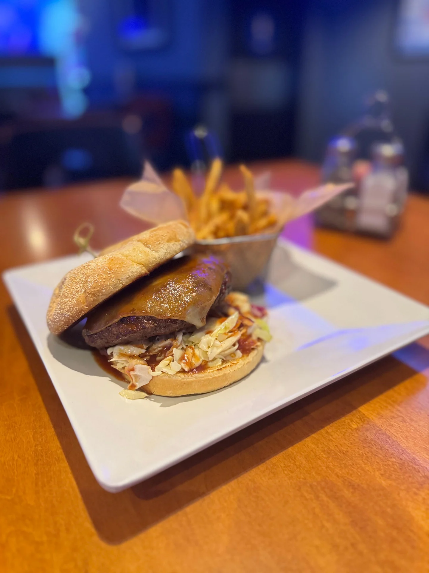 Caribbean Jerk Burger - 100% Free Range Angus Beef Patty from Northern AZ with Jerk Rub, Pepper Jack Cheese, Spicy Slaw, Tomato & a Spicy Tropical BBQ.
