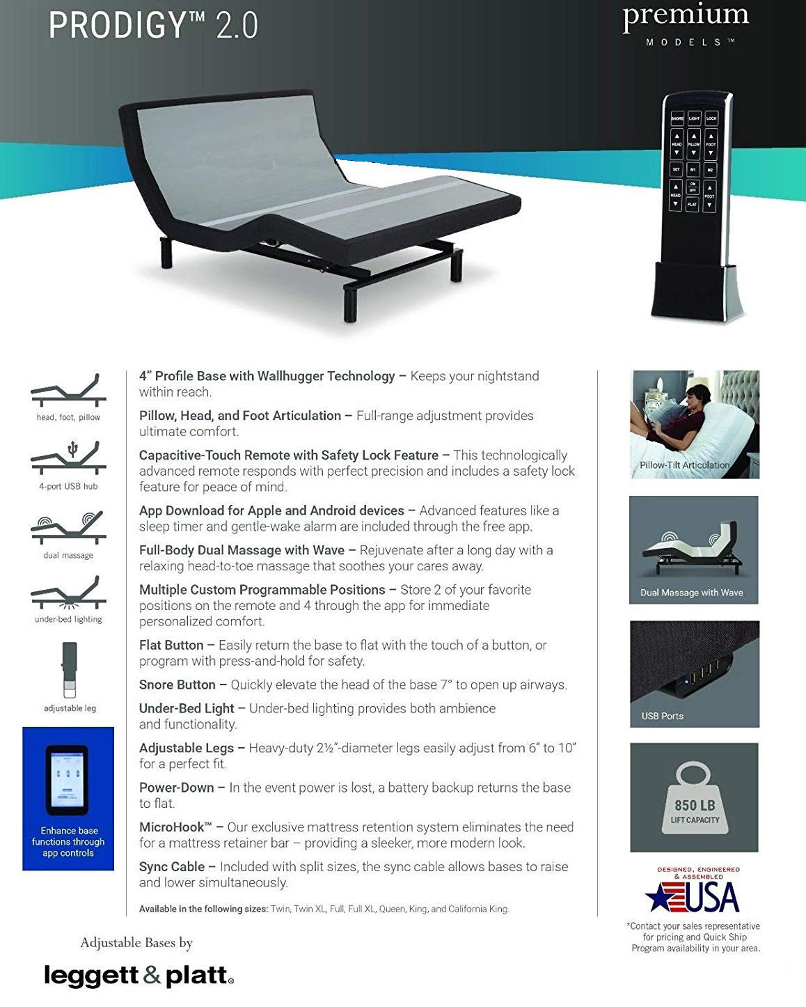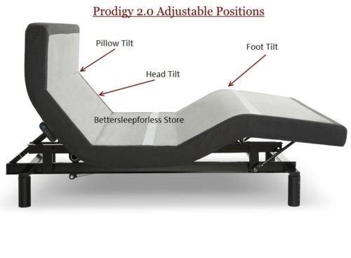 Capacitive-touch remote. The Prodigy 2.0 adjustable base comes with the industry's first capacitive-touch remote control. The remote offers many features including programmable positions and a snore button. A convenient table-top holder for the remote is included to keep comfort within your reach. Bluetooth app for Apple and Android phones. App controls are now included for both Apple and Android devices, bringing the Prodigy 2.0 base to a new level of function. A sleep timer, a gentle-wake alarm, and more are included in the app. Micro hook retention system. Our all-new micro hook retention system keeps your mattress from slipping as the base articulates, removing the need for a mattress retainer bar at the foot of your bed and giving your room a sleeker, more modern look. Pillow-tilt articulation. Optimize your comfort with the addition of pillow tilt, which adjusts to support your head while you read, work, or watch tv in bed. Full-body massage. The fully adjustable dual massage, built into the adjustable base, incorporates our wave technology. You can adjust the intensity of the waves, giving you extreme relaxation from head to toe. USB ports. Located on either side of the base, two 4-port USB hubs allow you to charge up to eight USB devices from the comfort of your bed. Under-bed lighting. Multi-directional under-bed lighting is fully dimmable, providing both ambience and functionality. Adjust under-bed lights using the remote control or app. Under-bed lighting can be programmed with the alarm clock feature to create a refreshing wake-up scene. Wallhugger Technology. New Prodigy 2.0, Leggett and Platt adjustable bed base. Wallhugger Technology and Pillow Tilt keeps you closer to your night stand. Pillow Tilt - no more bunching pillows behind your head, Head and foot articulation, Pre-Program your favorite seating positions, Furniture Grade Upholstery in Black, Dual Body massage with Wave Feature, Adjustable Legs from 6”-10”, 1700 lb. total max lifting capacity. 9" Classic Latex Mattress Included. This twin size adjustable bed includes a 9" Classic Latex mattress. • The redesigned Prodigy 2.0 adjustable bed base features furniture-grade upholstery in black. • Capacitive-touch remote. • Adjustable legs 6"-10". • Pillow-tilt articulation. • Bluetooth connectivity. • Wall hugger engineering. • Full-body massage. • Under-bed lighting. • USB charging ports. • App controls - app controls are now included for both Apple and Android mobile phones and tablets. • Includes Electropedic Classic Latex 9" mattress.